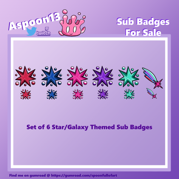A set of 6 star/galaxy themed sub badges. All pre-sized to meet twitch's standards at 72,36 and 18 pixels. Will also include a set of 112 pixel badges for use as channel point icons. Please credit me as the artist @Aspoon13